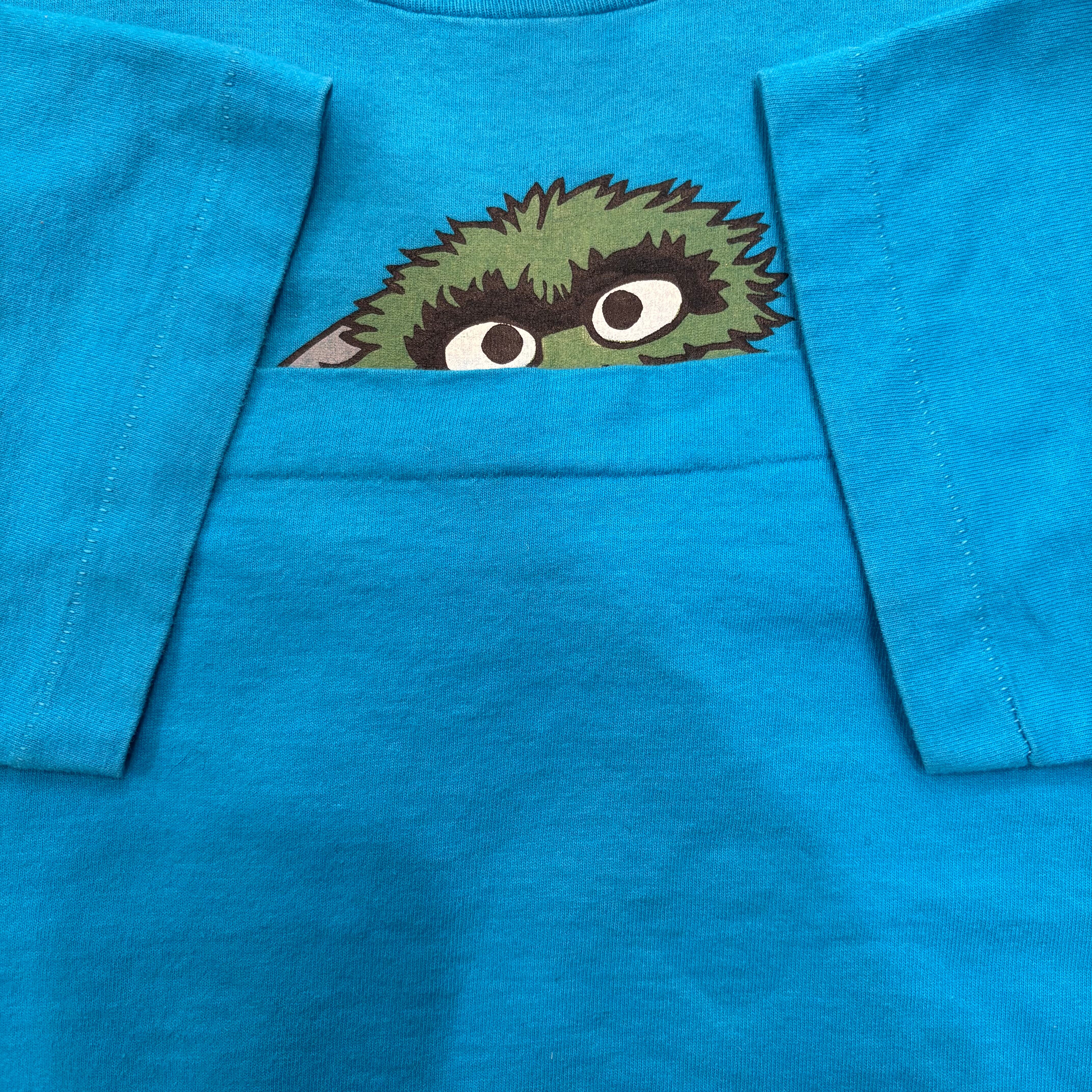 セサミストリートの中でも出現率の低いオスカーのプリントが良いTシャツです。