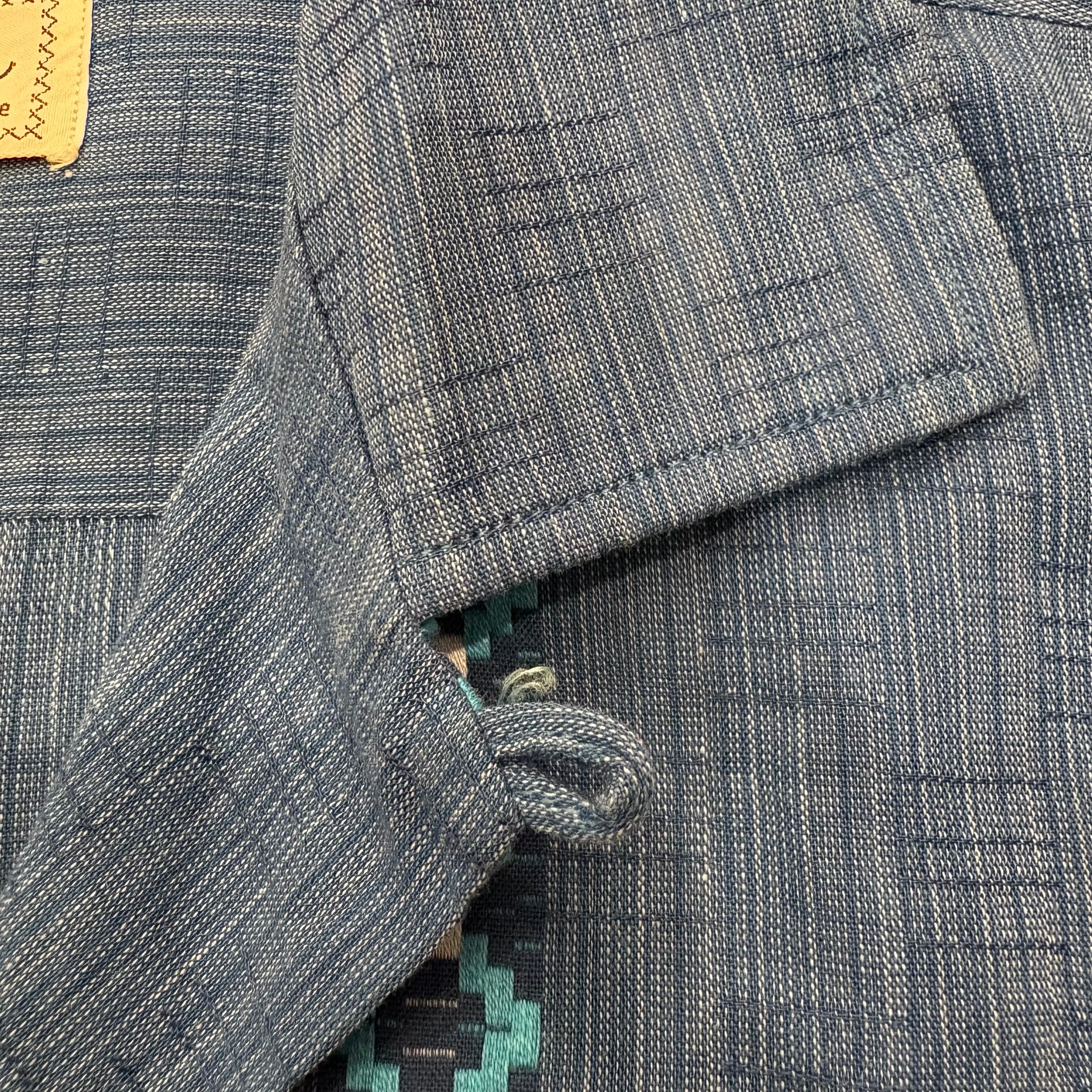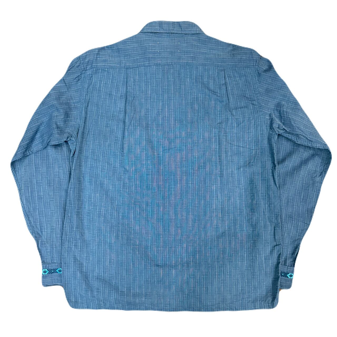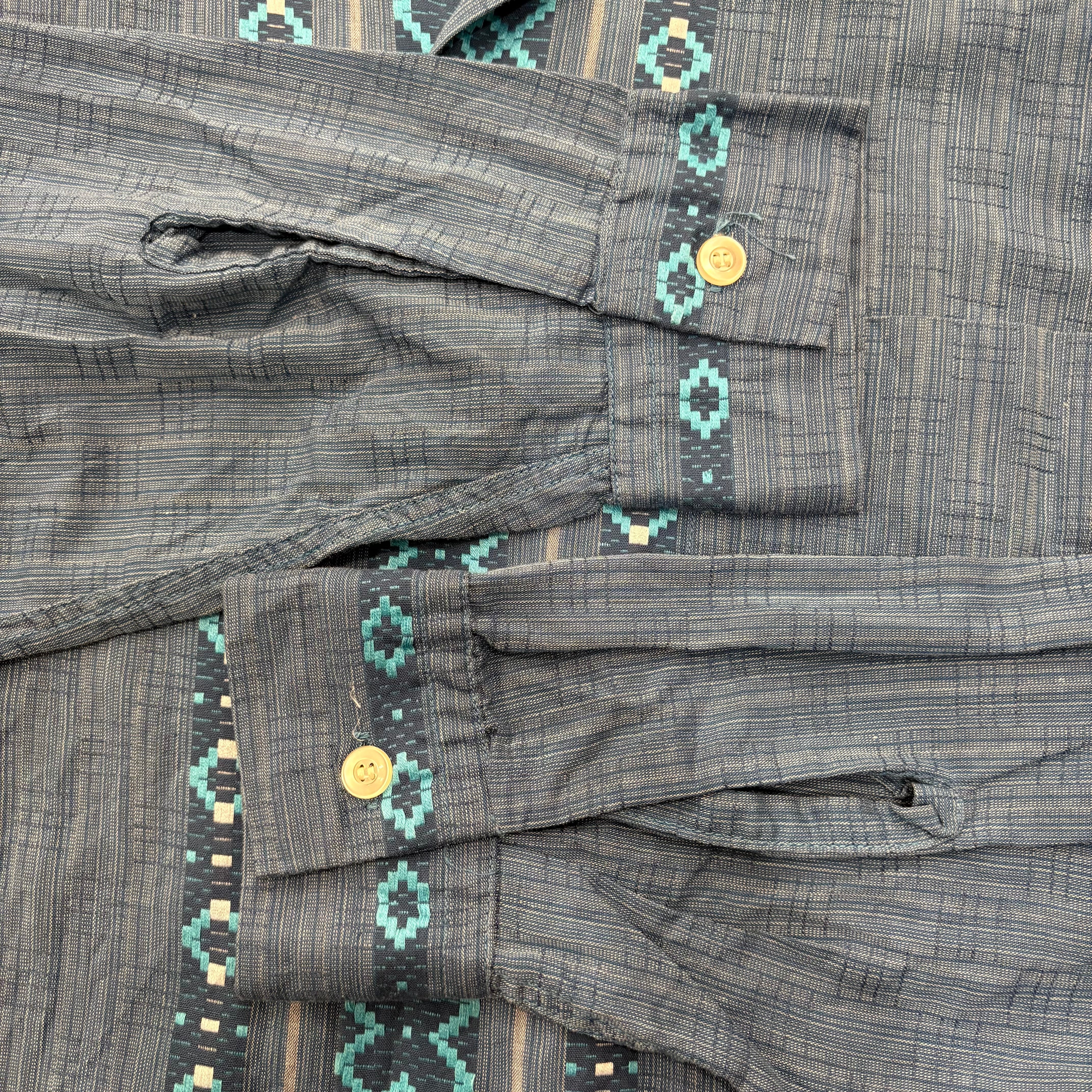 オープンカラーで前立てとカフスに民族調な柄が入っているのが特徴的なシャツです。