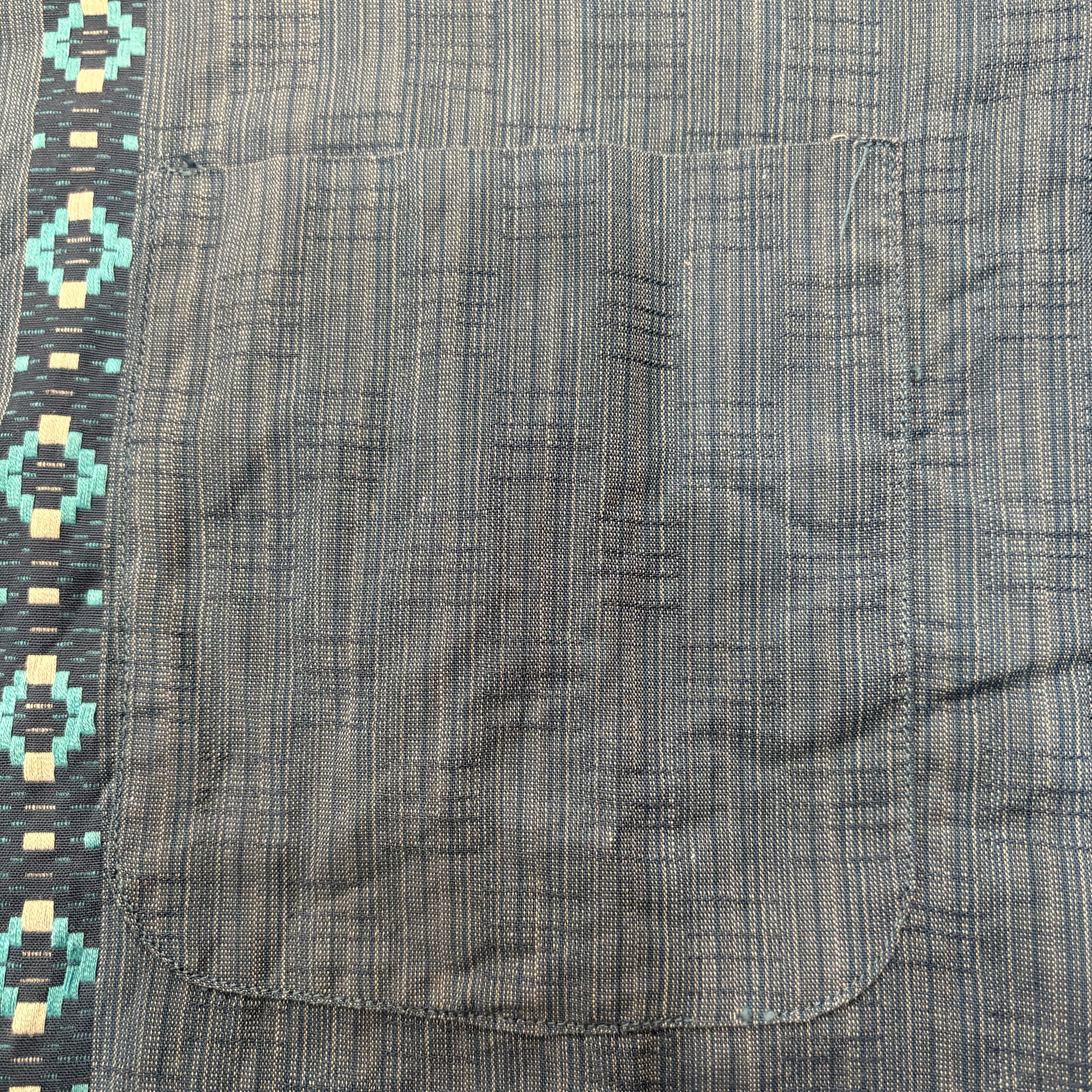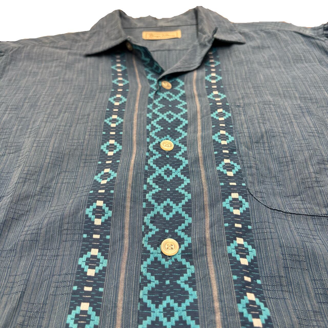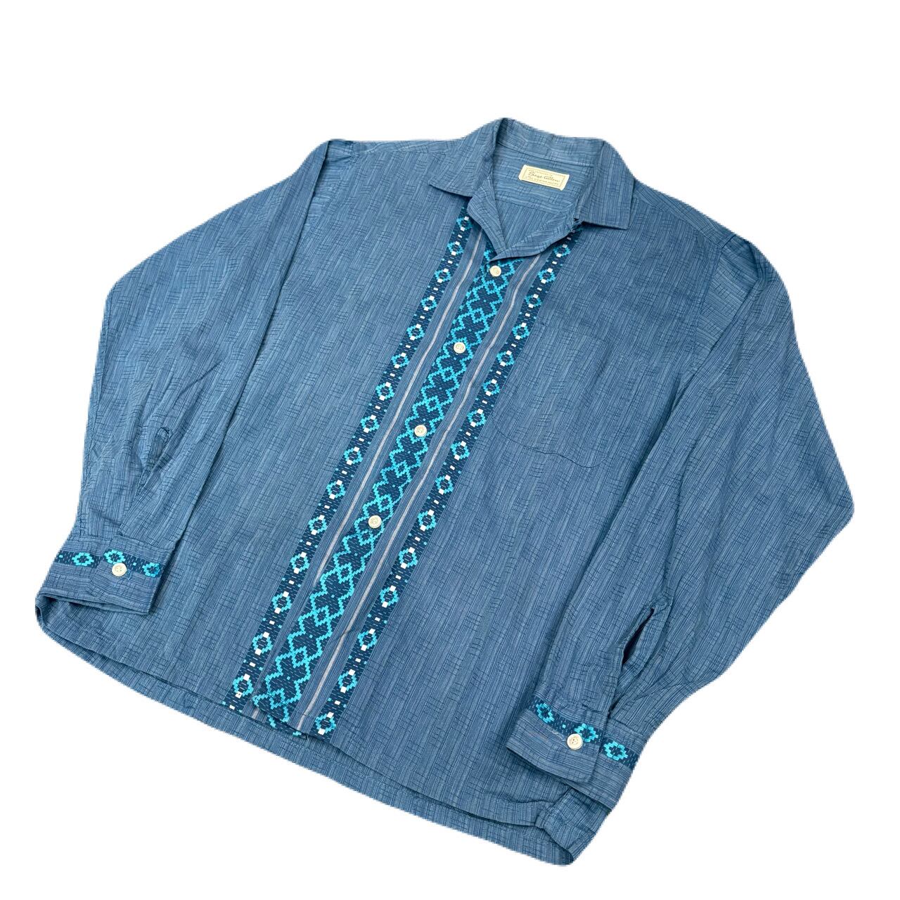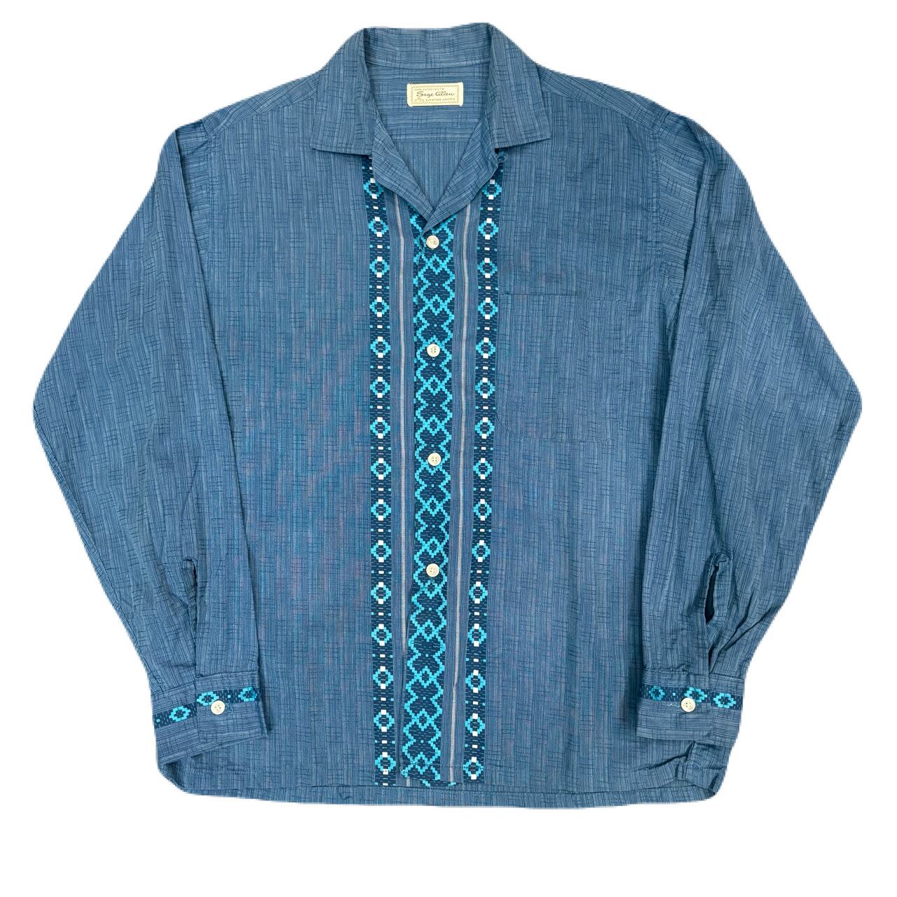 オープンカラーで前立てとカフスに民族調な柄が入っているのが特徴的なシャツです。