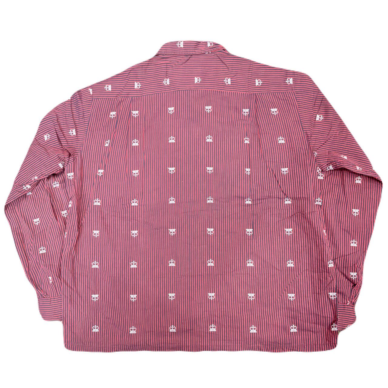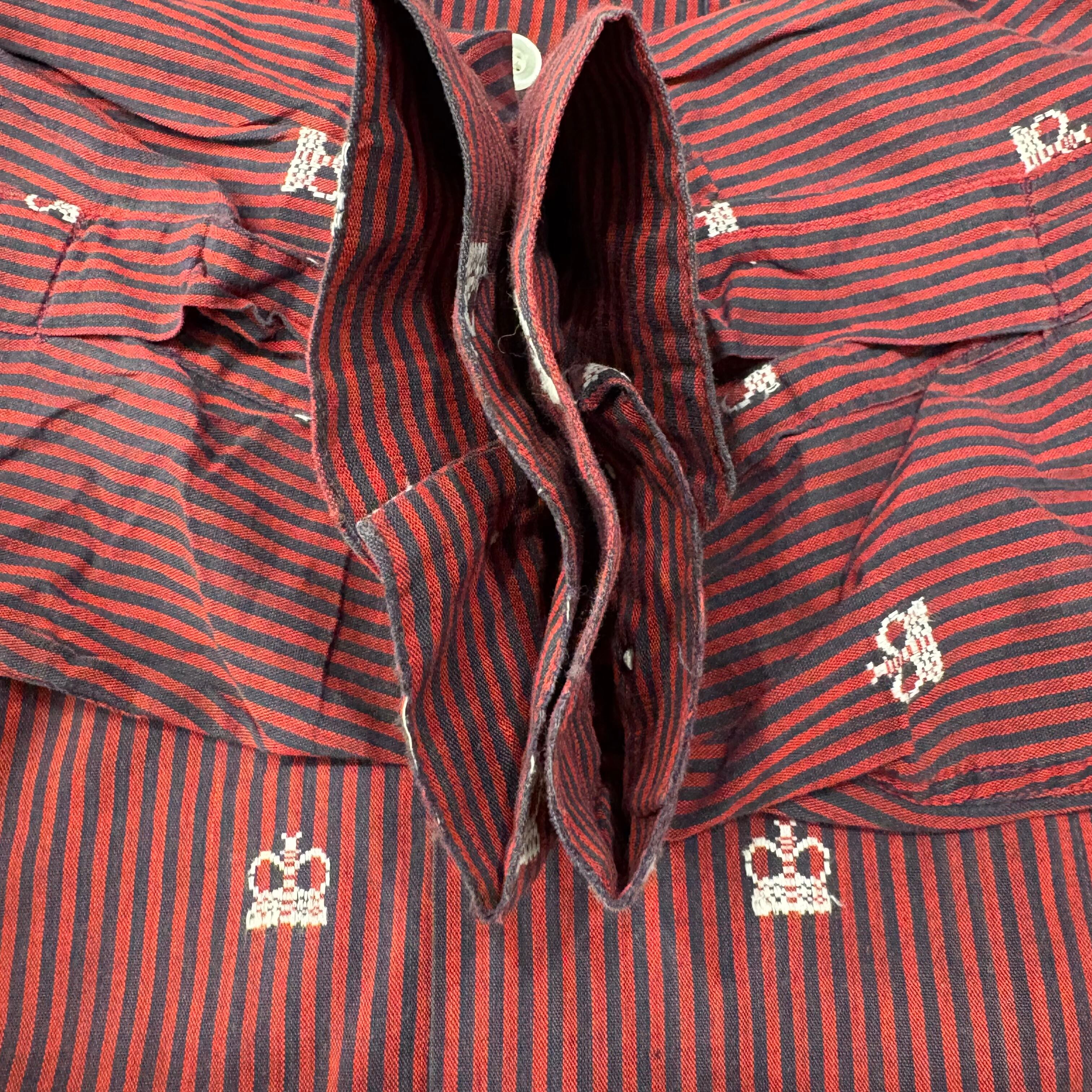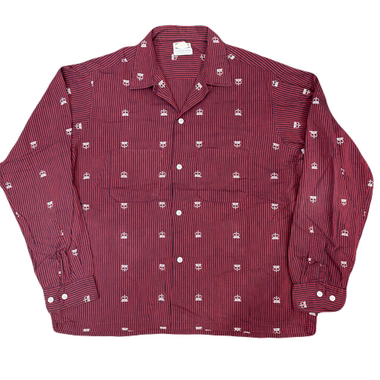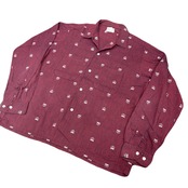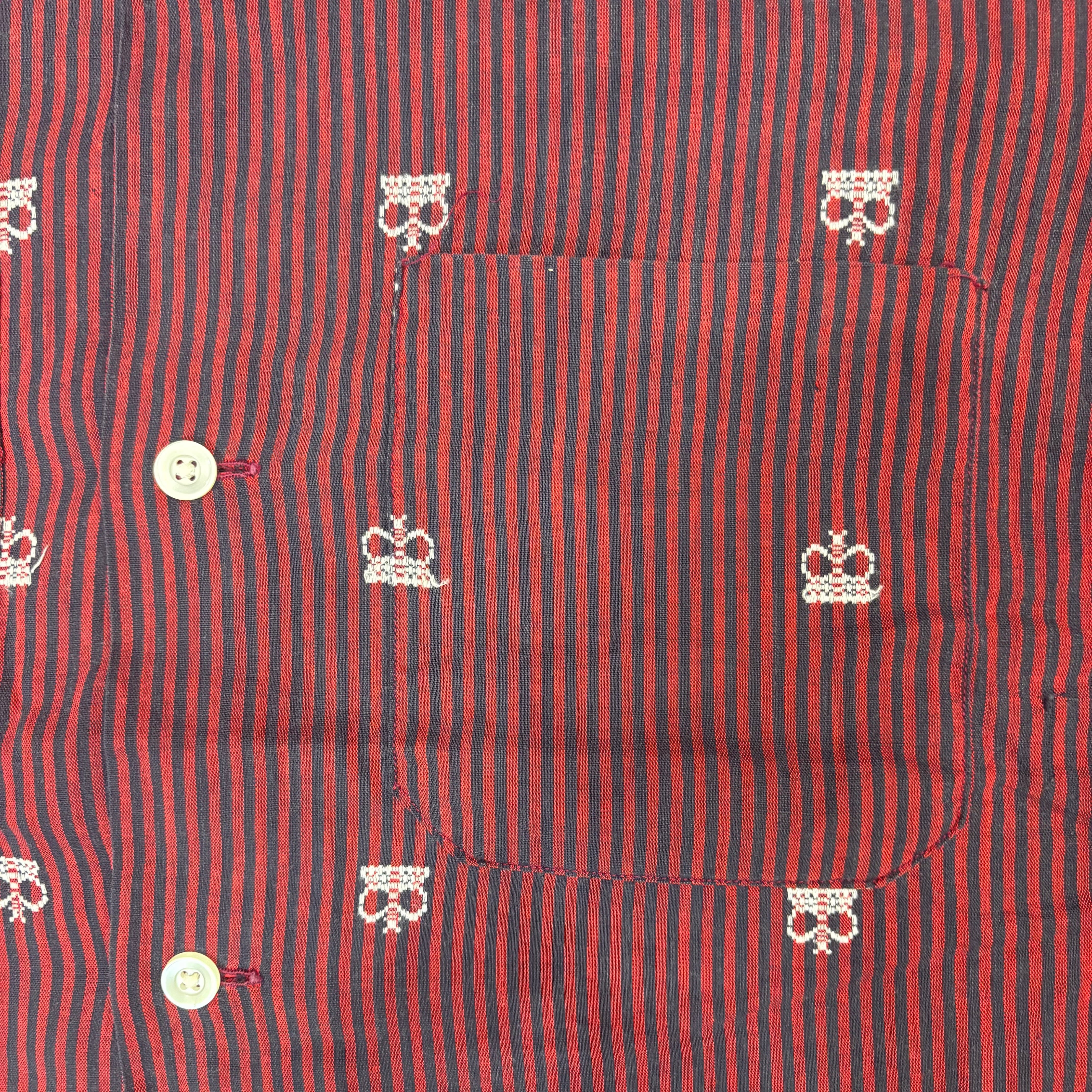 深めな赤×黒のストライプに織柄が特徴的なオープンカラーシャツです。