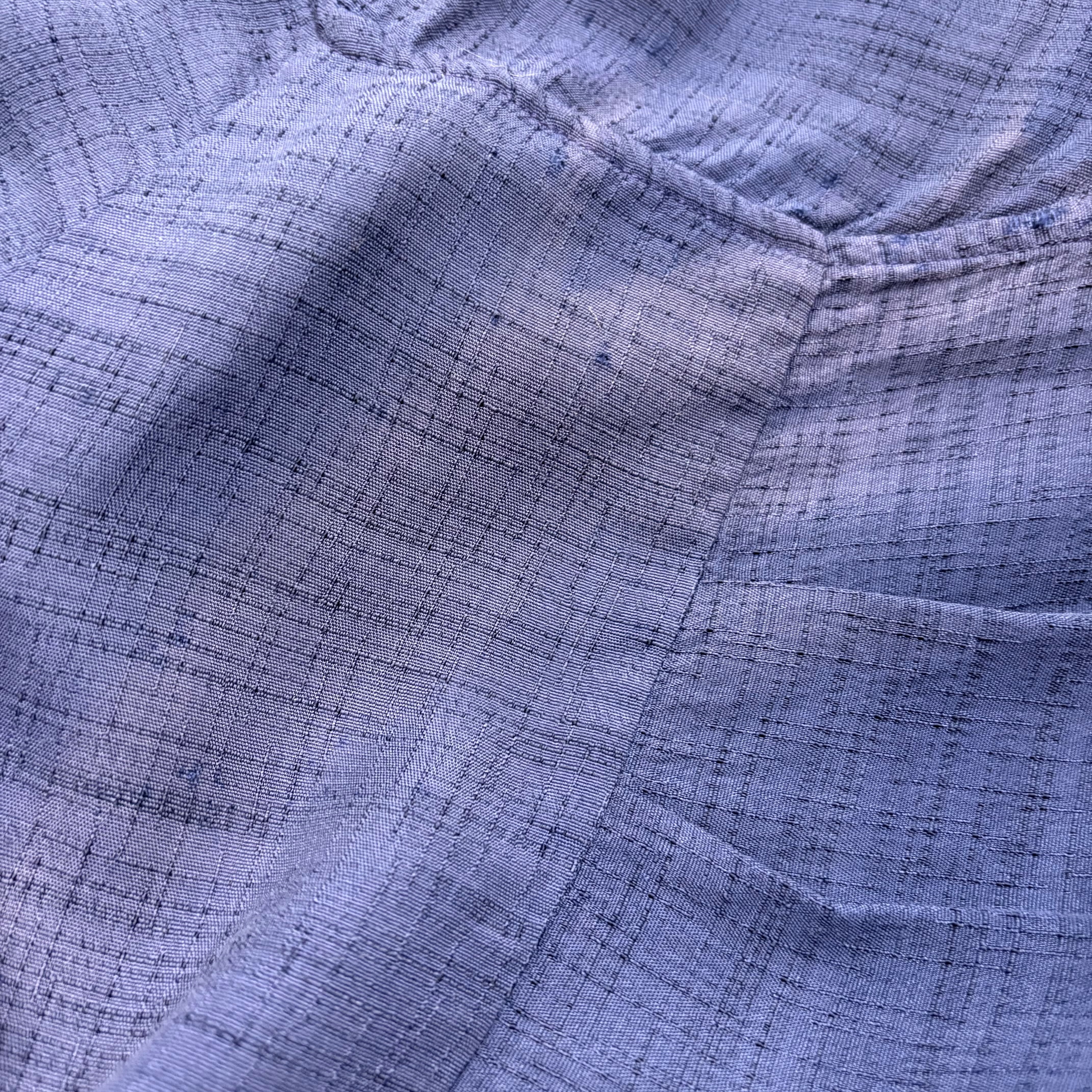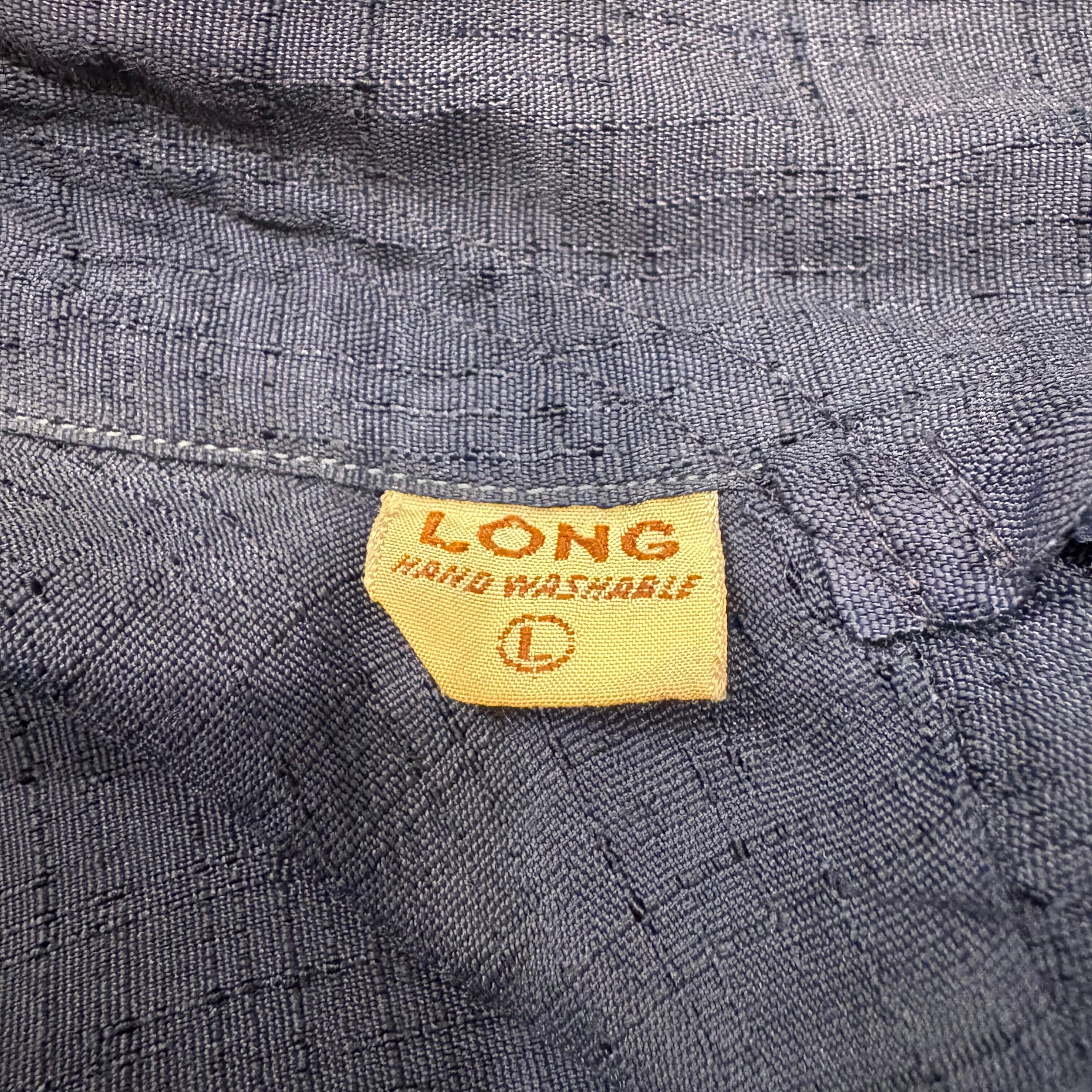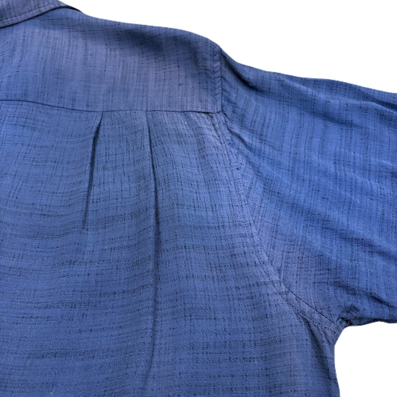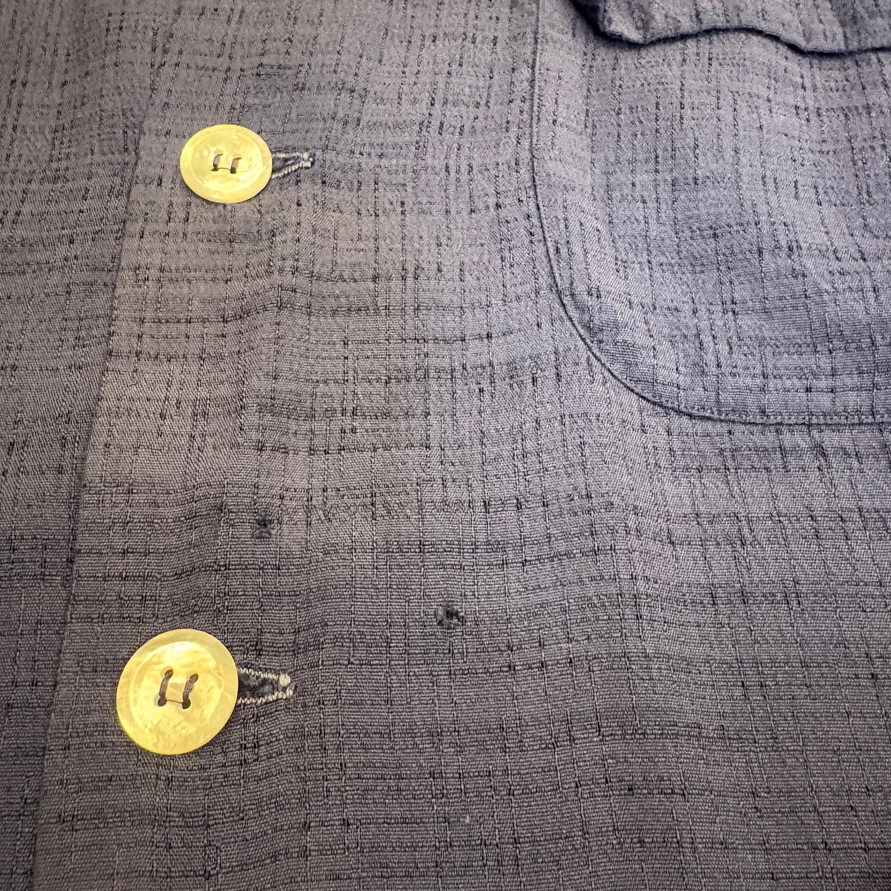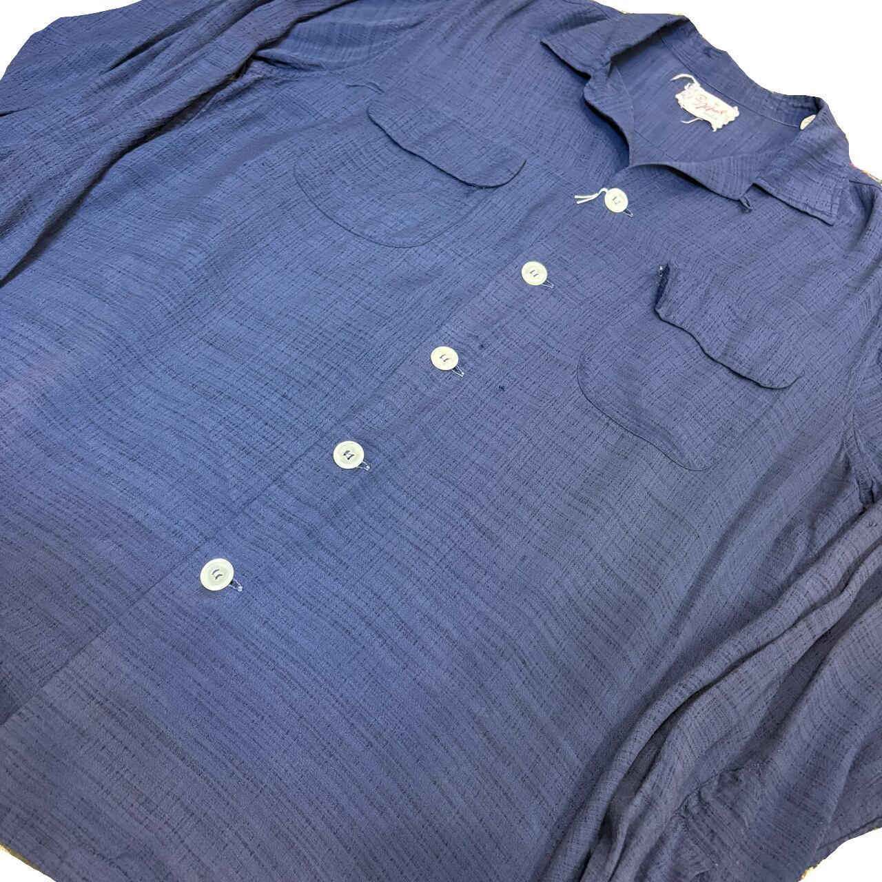 ニューヨークのテーラー物⁈と推測できる細部に拘った異常に仕立ての良いシャツです。人気のダークカラー(ネイビー)のレーヨンでカスリ柄、多少のフェードも良いアジと判断してもらえるかと思います。