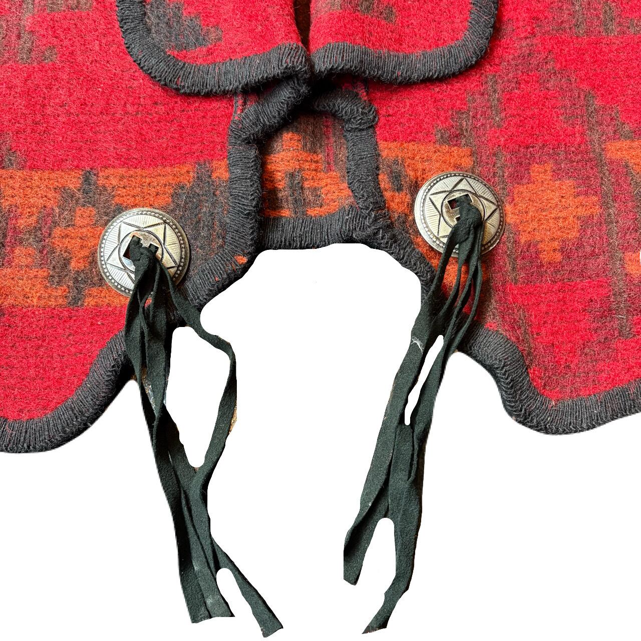 ラルフの定番なネイティブパターン物の中でも、一癖ある羽織り型のベストです。短丈を活かしてレイヤーを楽しめる面白い服かと思います。