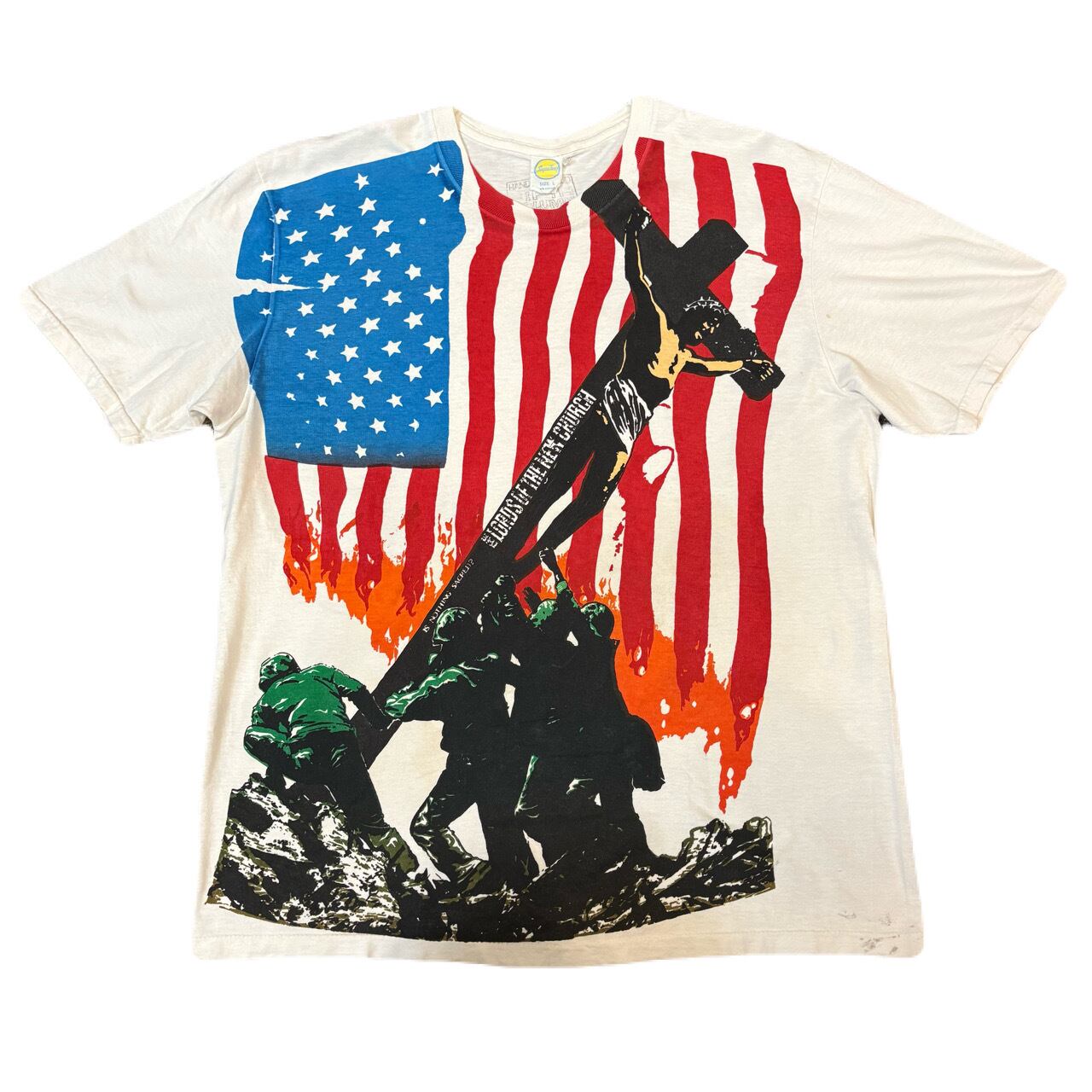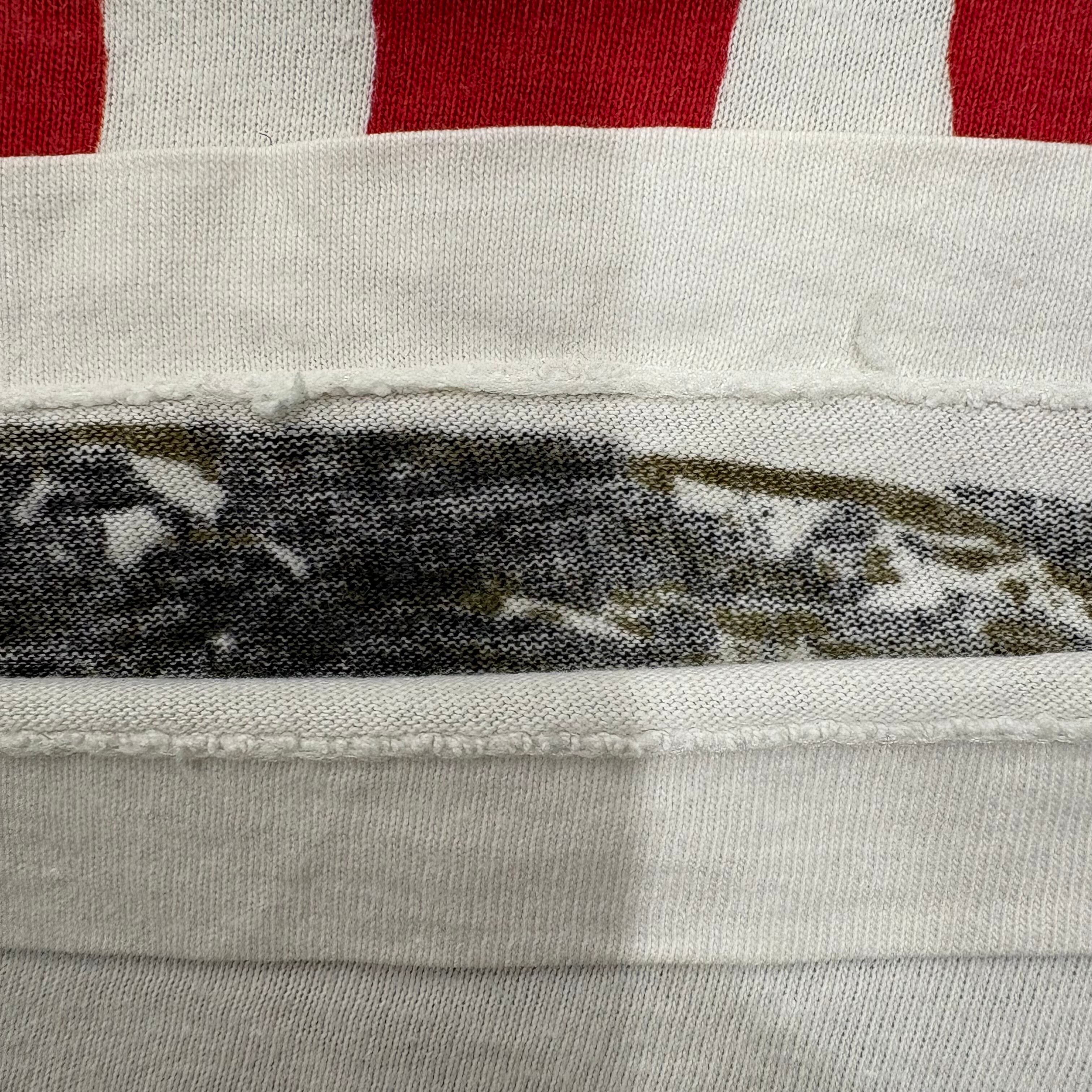 フィフスコラムらしい、縫製面や首リブを超える大判の手刷りプリントがカッコ良いです。