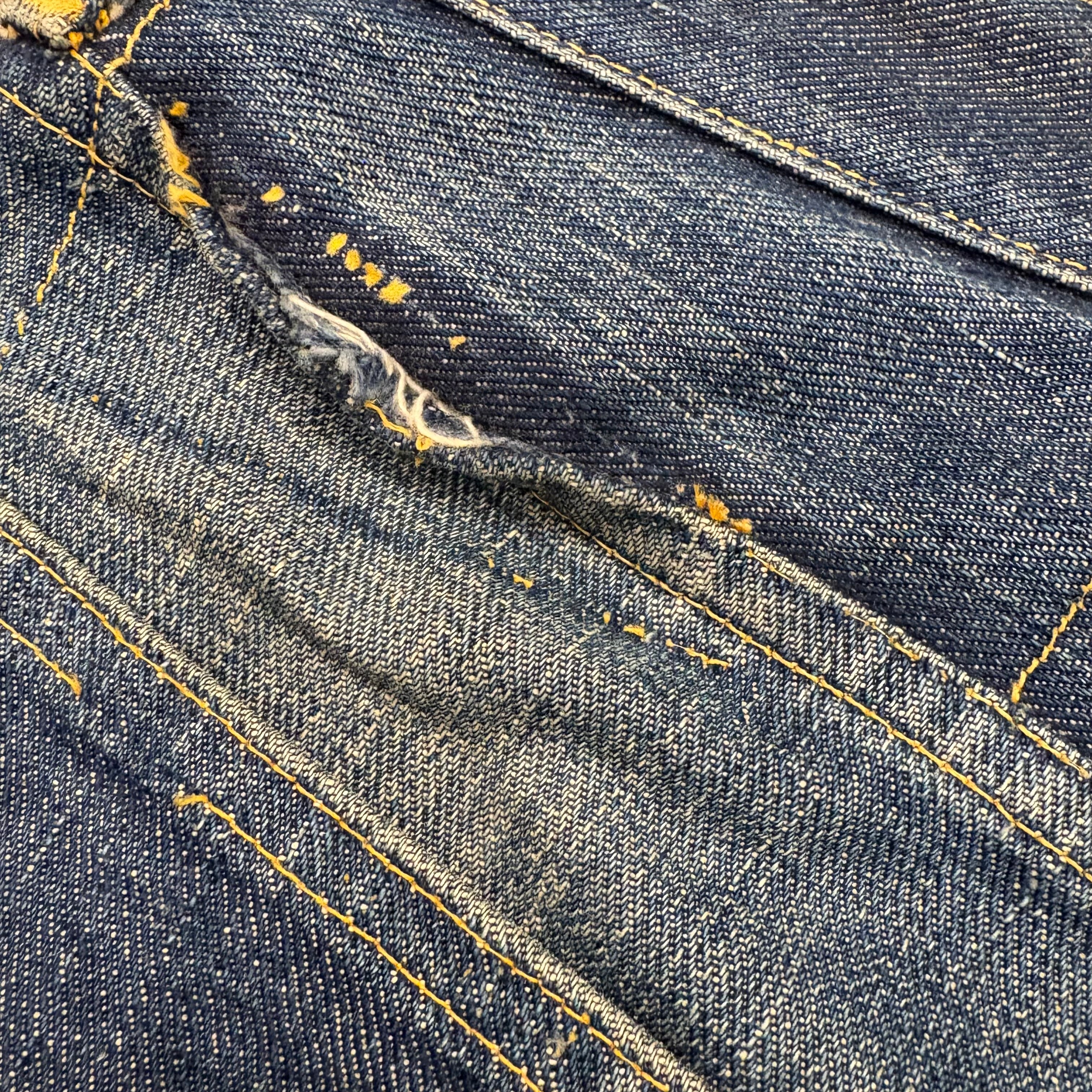 右膝リペアあり、コインポケット部分やバックポケット淵にホツレあり、腰帯下部分などにステッチ抜けあり