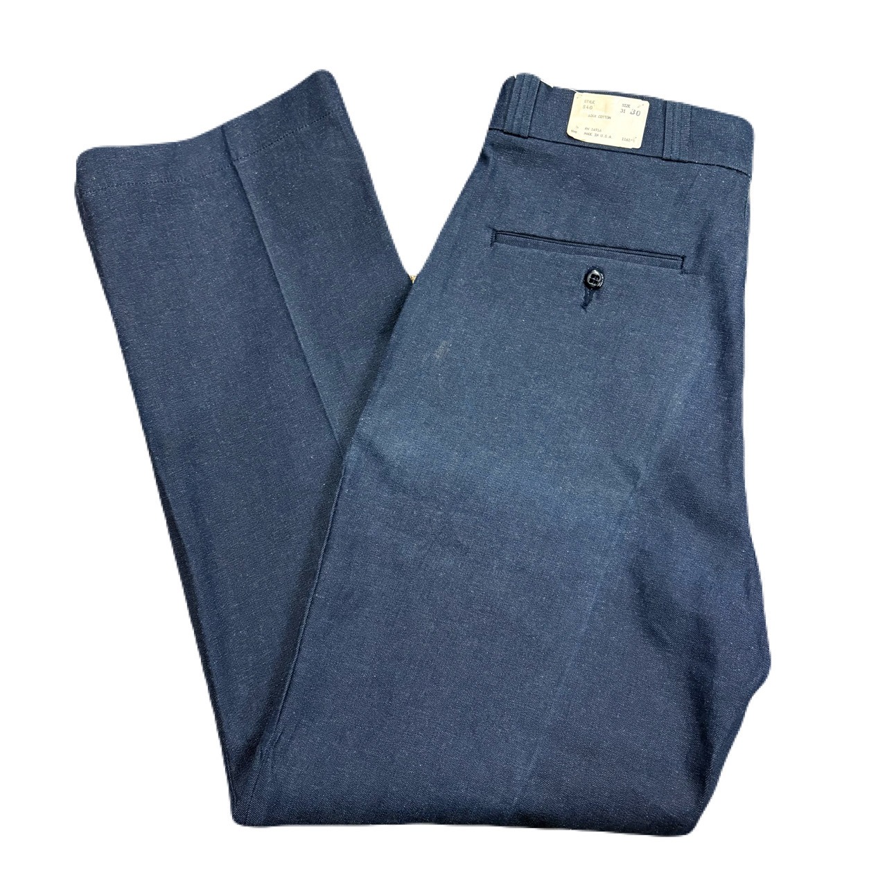 70S物にはなりますが、綿100%仕様の貴重なデッドストックチノです。穿きこんで色落ちを楽しみたい方におすすめです。薄ら畳みヤケはありますが、すぐに目立たなくなります。
