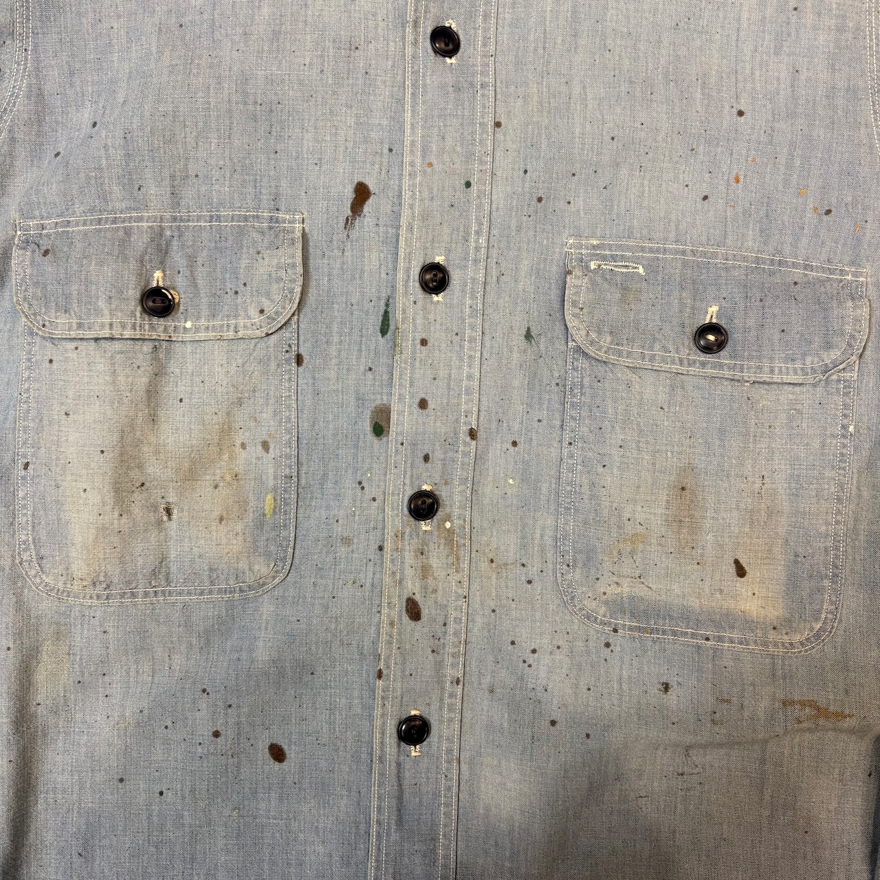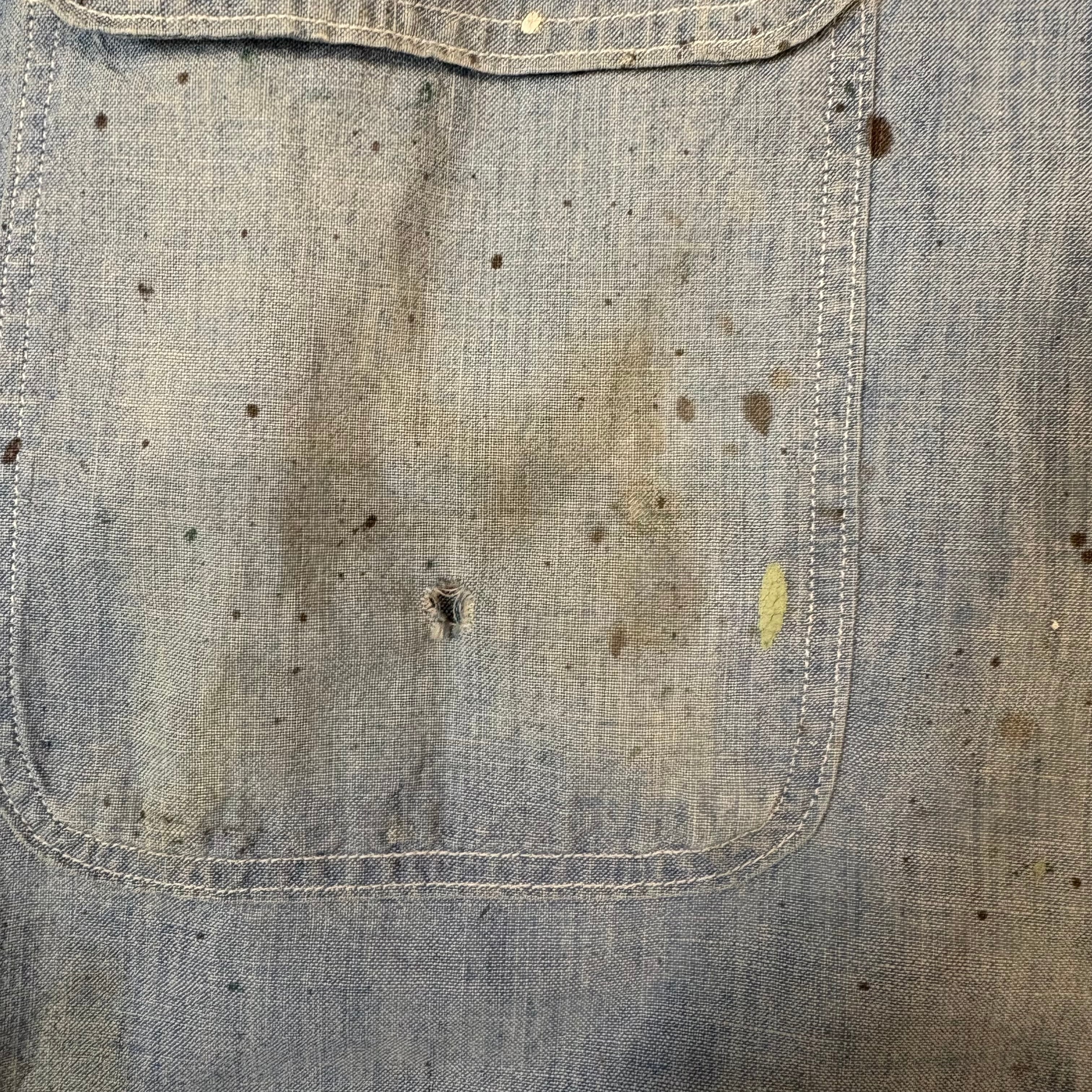 全体なペンキ飛び汚れ.背面の日焼け.襟にリペア.右ポケットにホールはございますが雰囲気のある商品です。