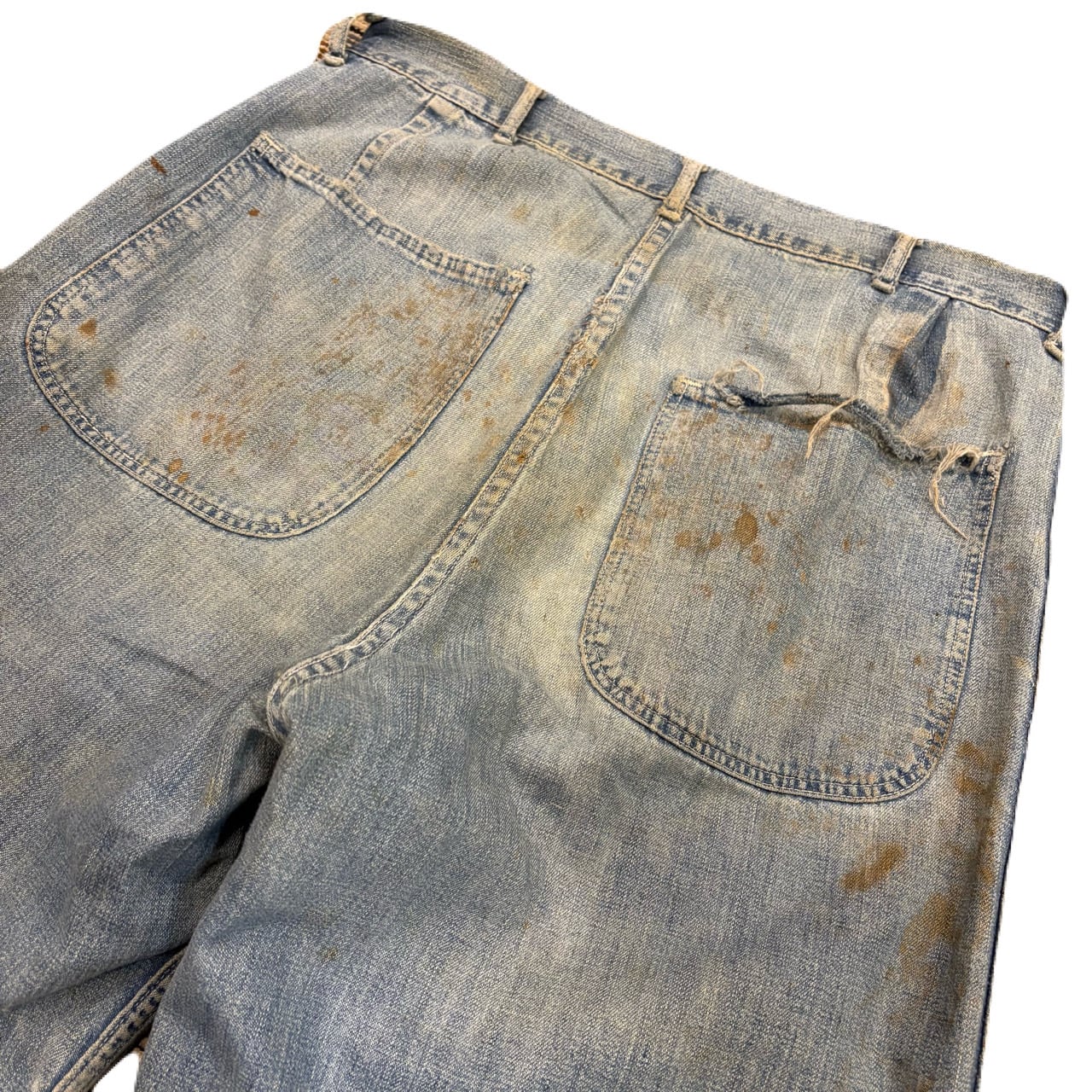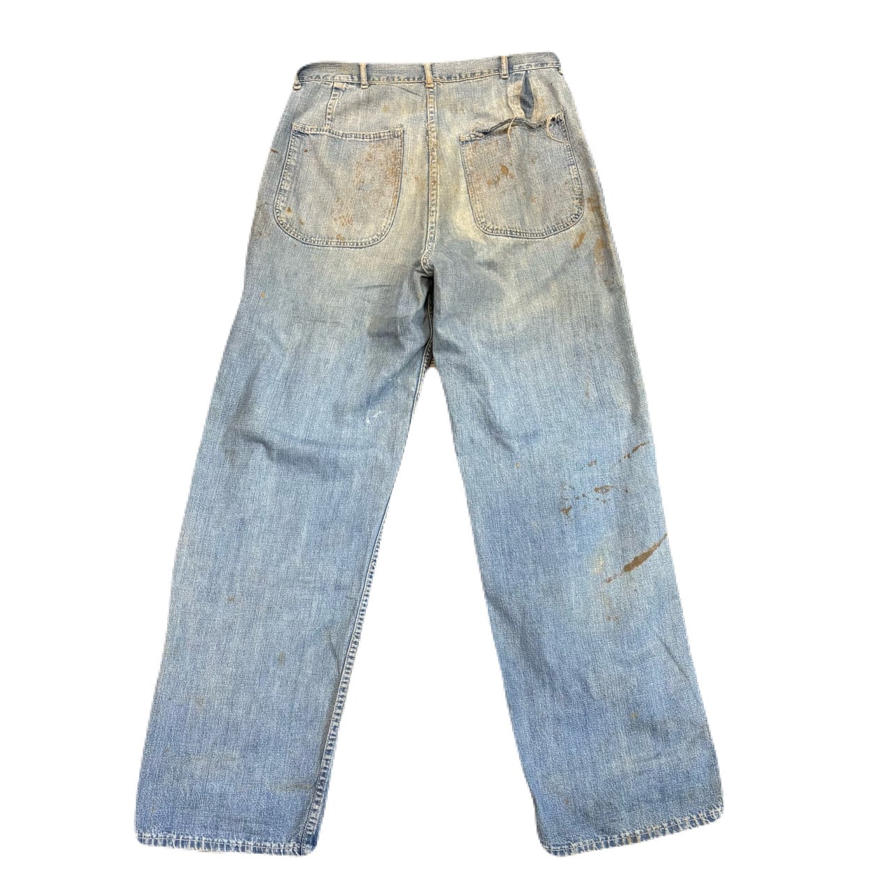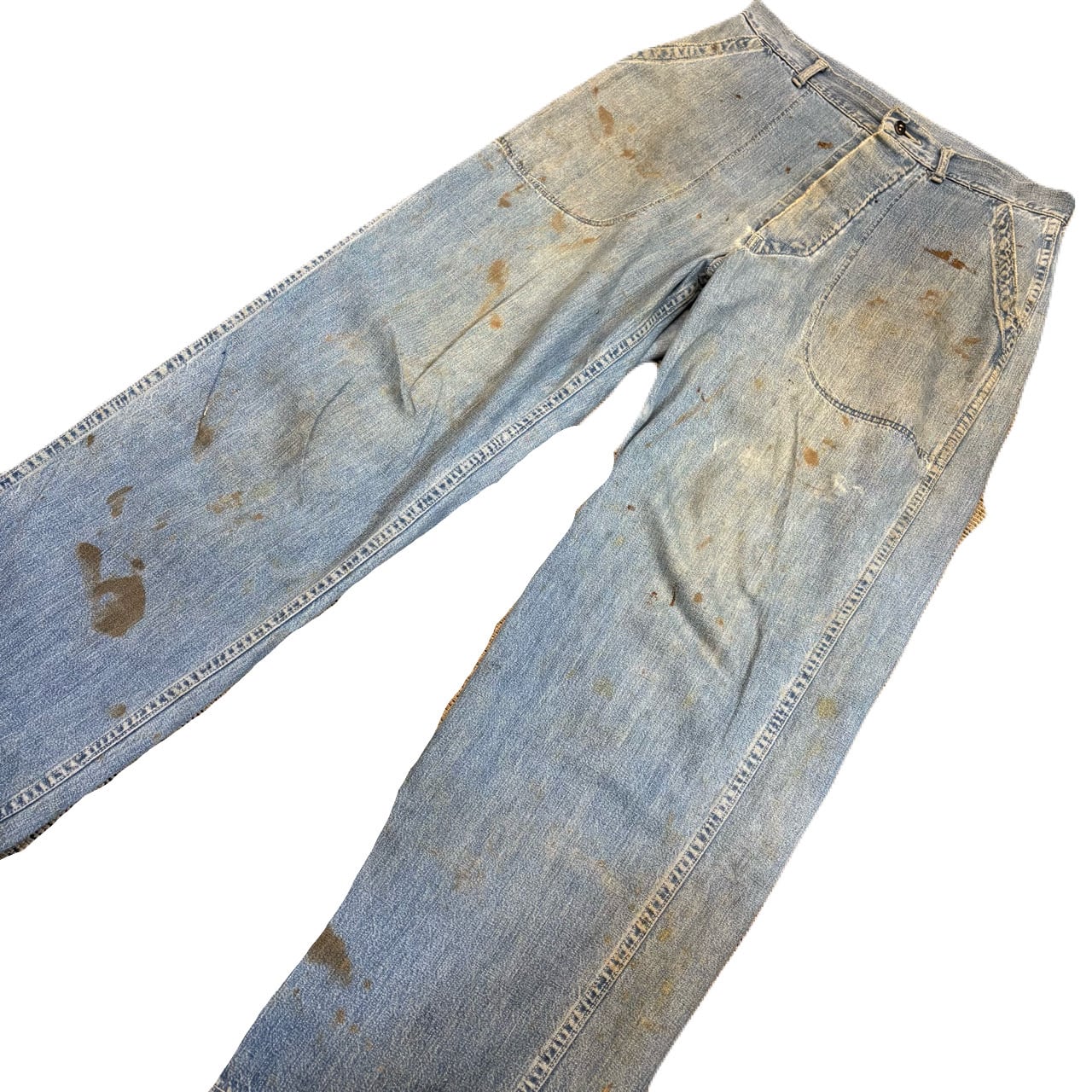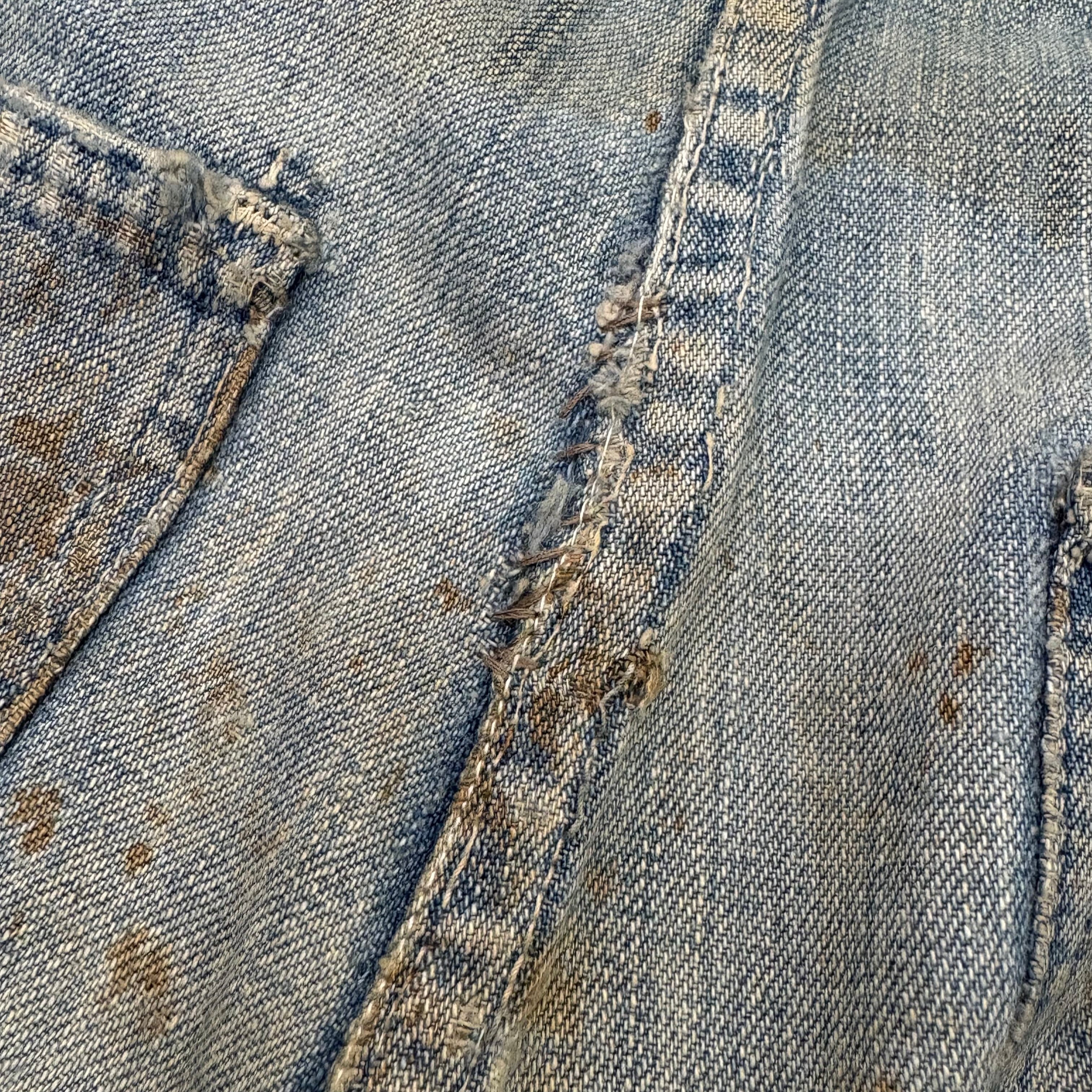 全体的な汚れあり、ポケット・股下・お尻などにリステッチやハンドリペアあり。ポケット淵などにホツレあり。フライボタン3つ替わってます。