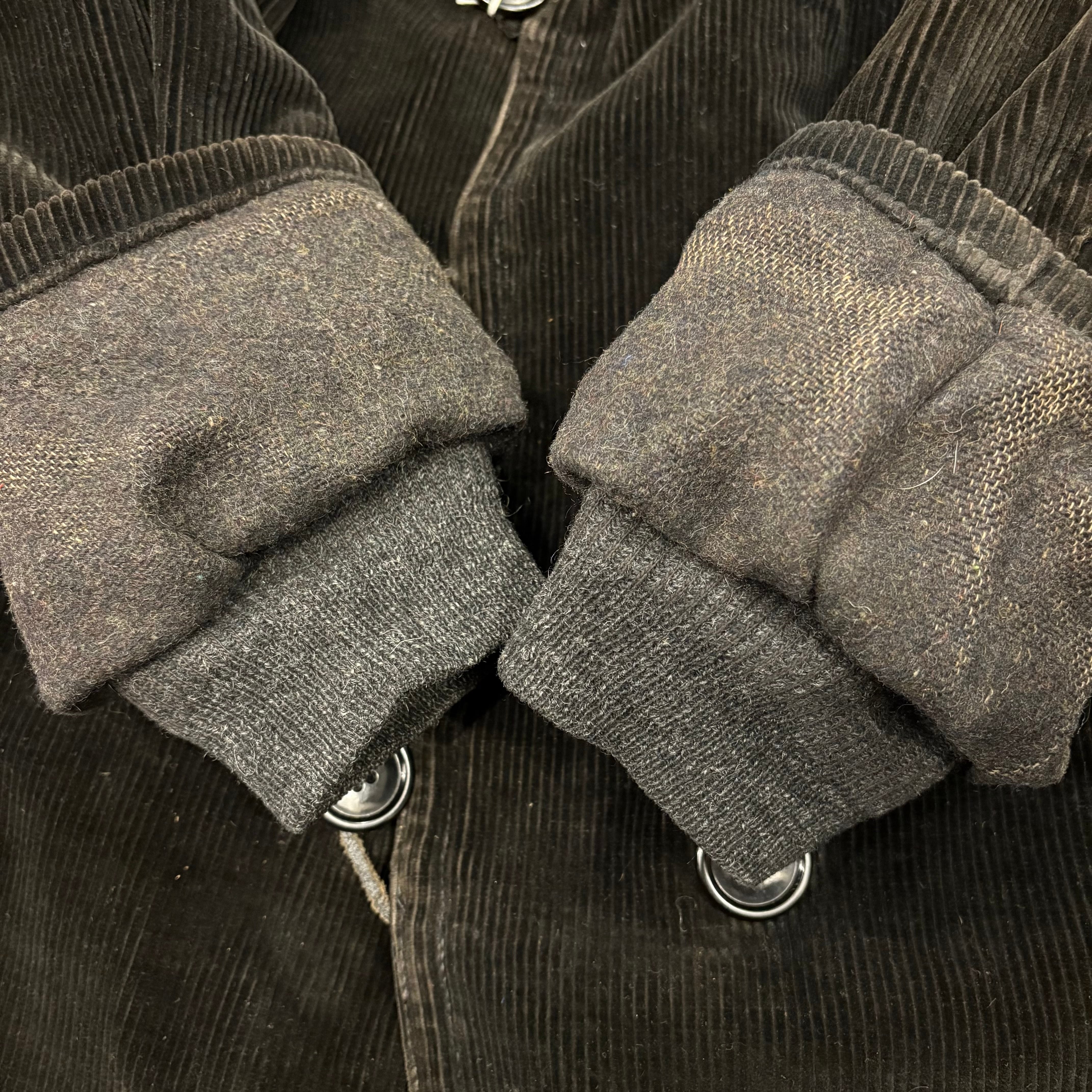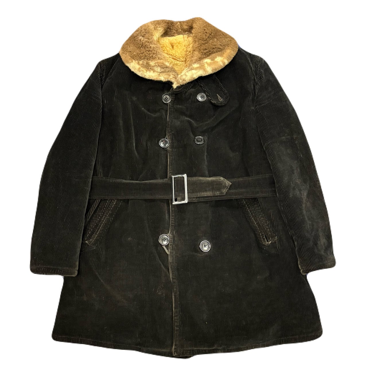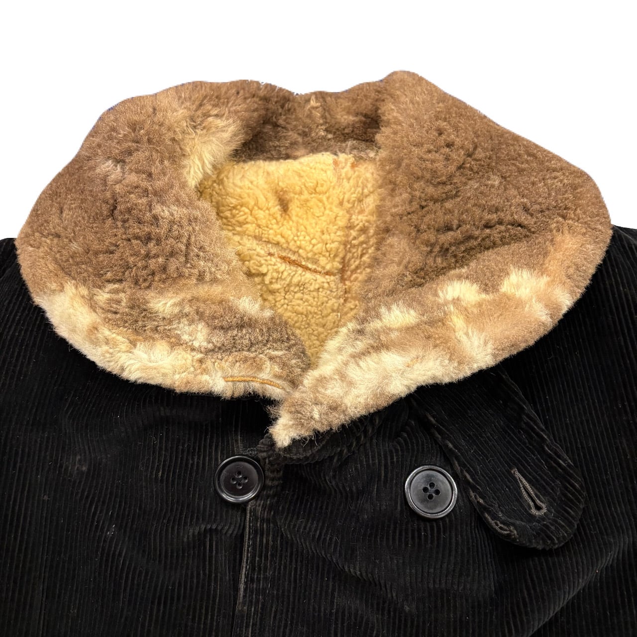 カーコートの黒コーズタイプになります。リペア箇所ありますが、裏ムートンを考えるとかなり状態は良い個体かと思います。襟ボアのマダラな毛色も良いイントネーションでおすすめです。