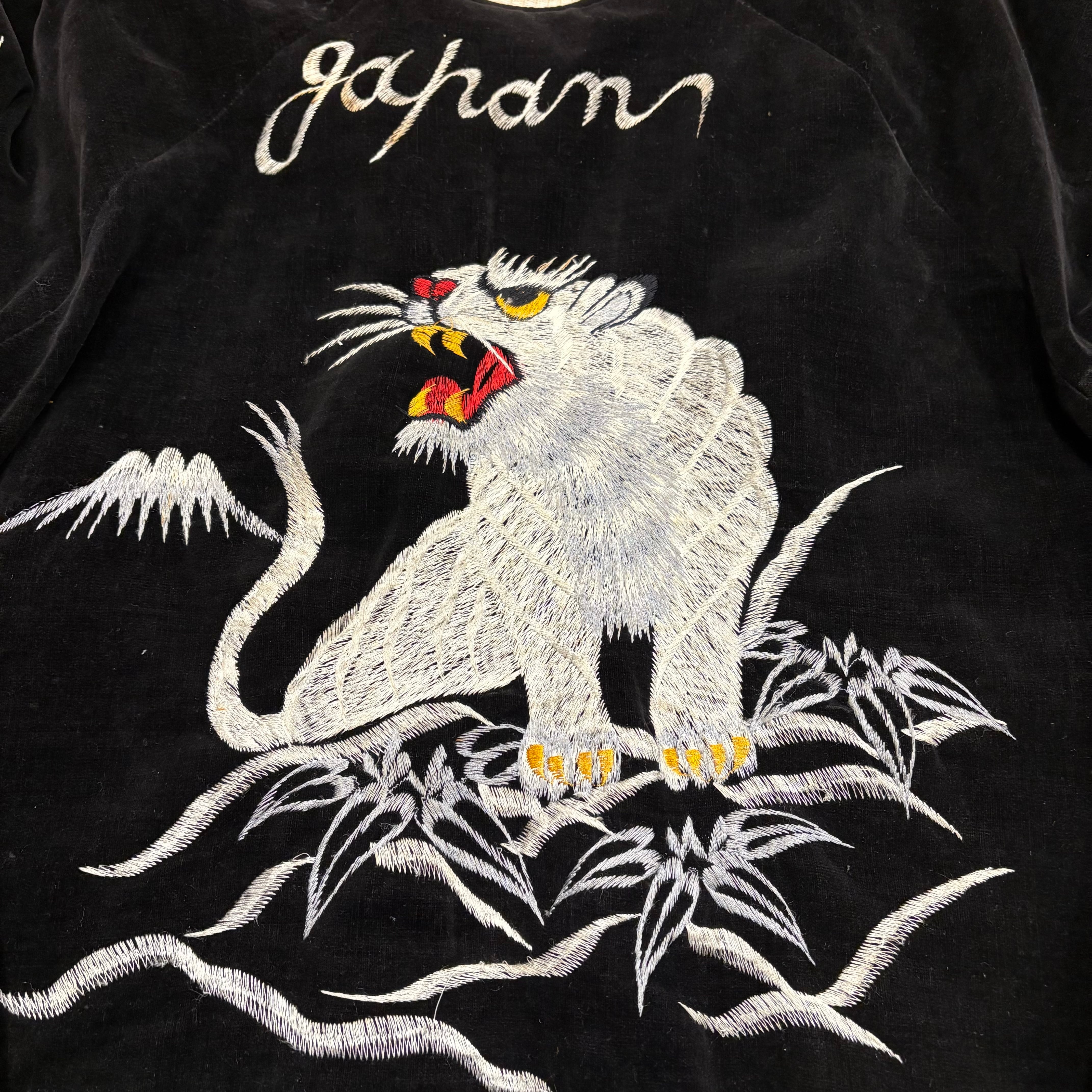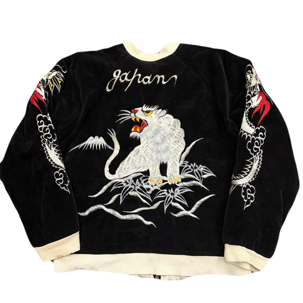 お探しの方が多い黒白スカジャンになります。サイズも小さめで程度も良くはないですが、販売基準に満たないボロは基本取り扱わないので、着用に問題はありません。すぐに破れて着れないってこともないです。状態考慮のお値段です。