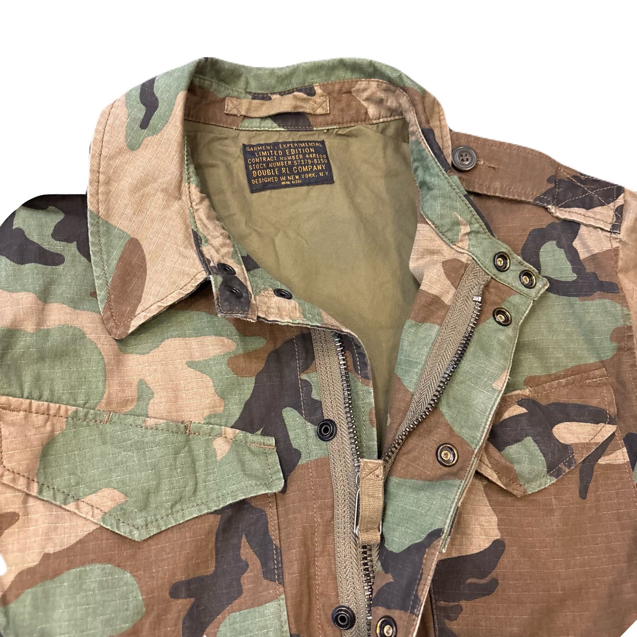 M-42 PARATROOPER FIELD JACKETをデザインソースにし、ウッドランドカモのリップストップコットンを使用するなどRRL独特なアレンジを加えた1着。