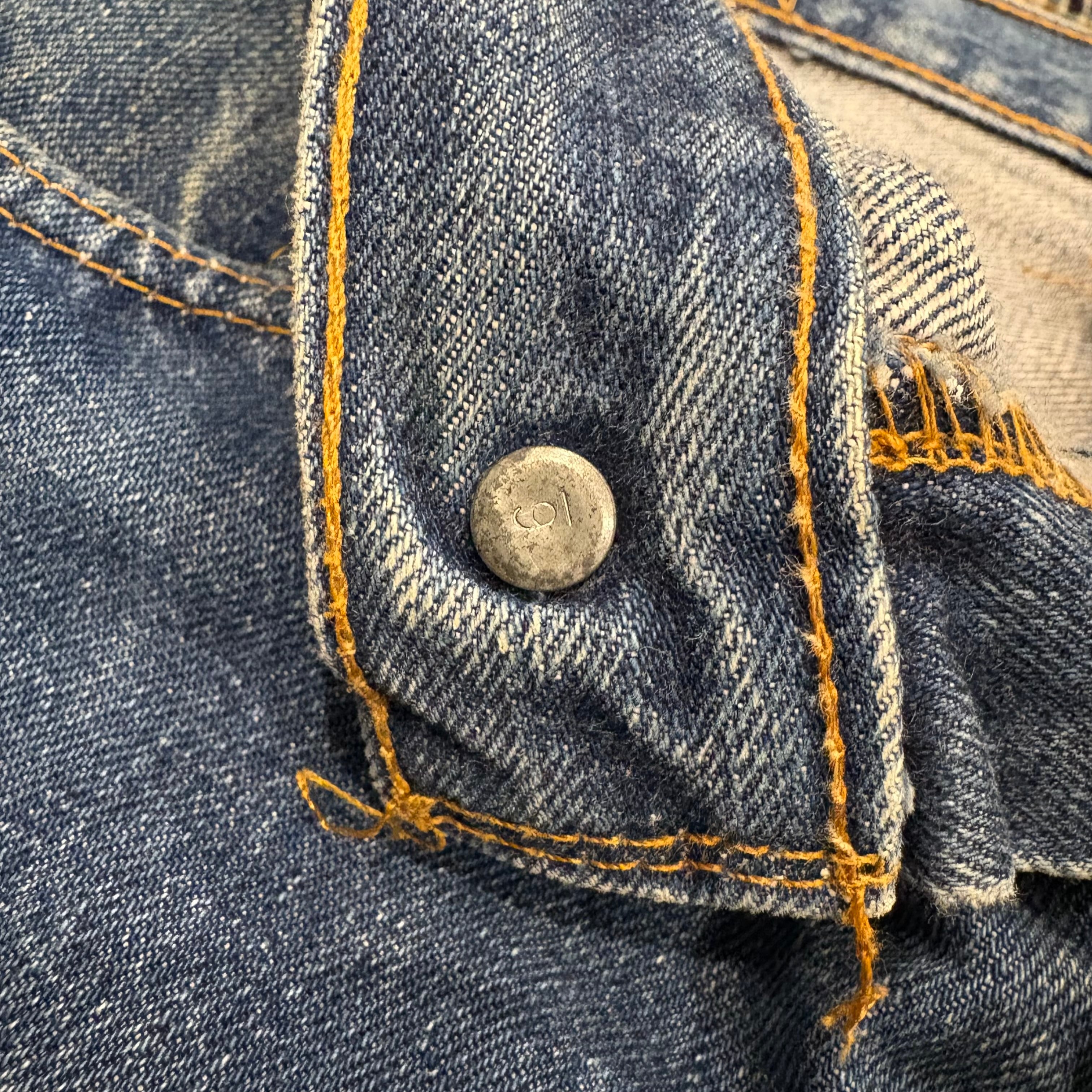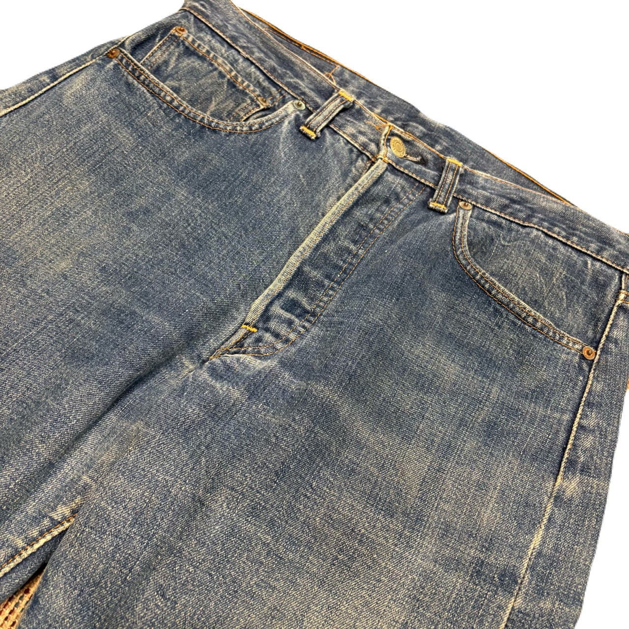 ビンテージデニムの登竜門的なリーバイスの501の66前期です。特別色濃いわけではないですが、66らしい綺麗な縦落ち、程よいヒゲ落ち、耳のアタリもしっかり出てて、何より生地がまだまだ強い状態なので長く穿いて頂けます。