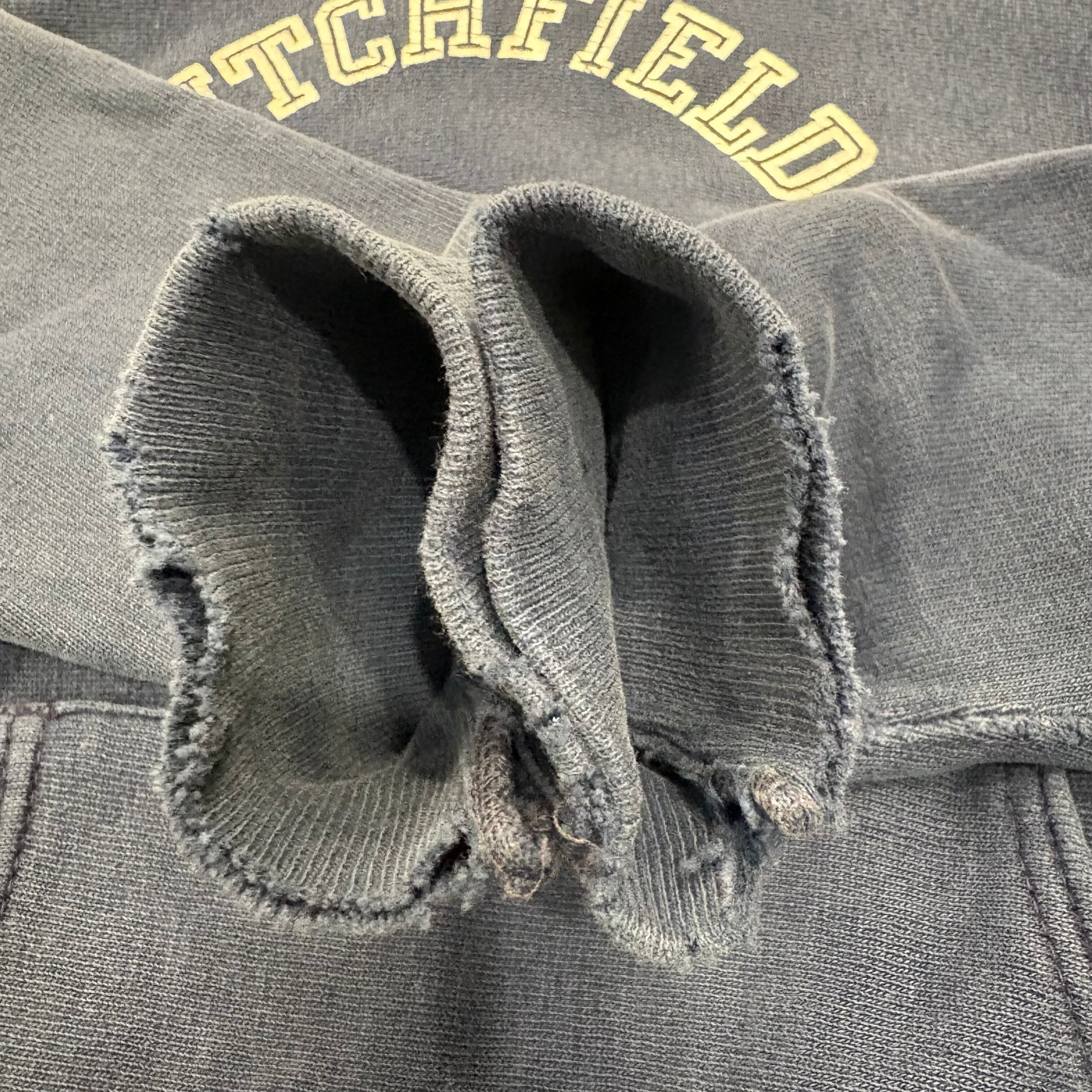 ポケットにピンホール.ハトメ周り.袖リブにダメージ
