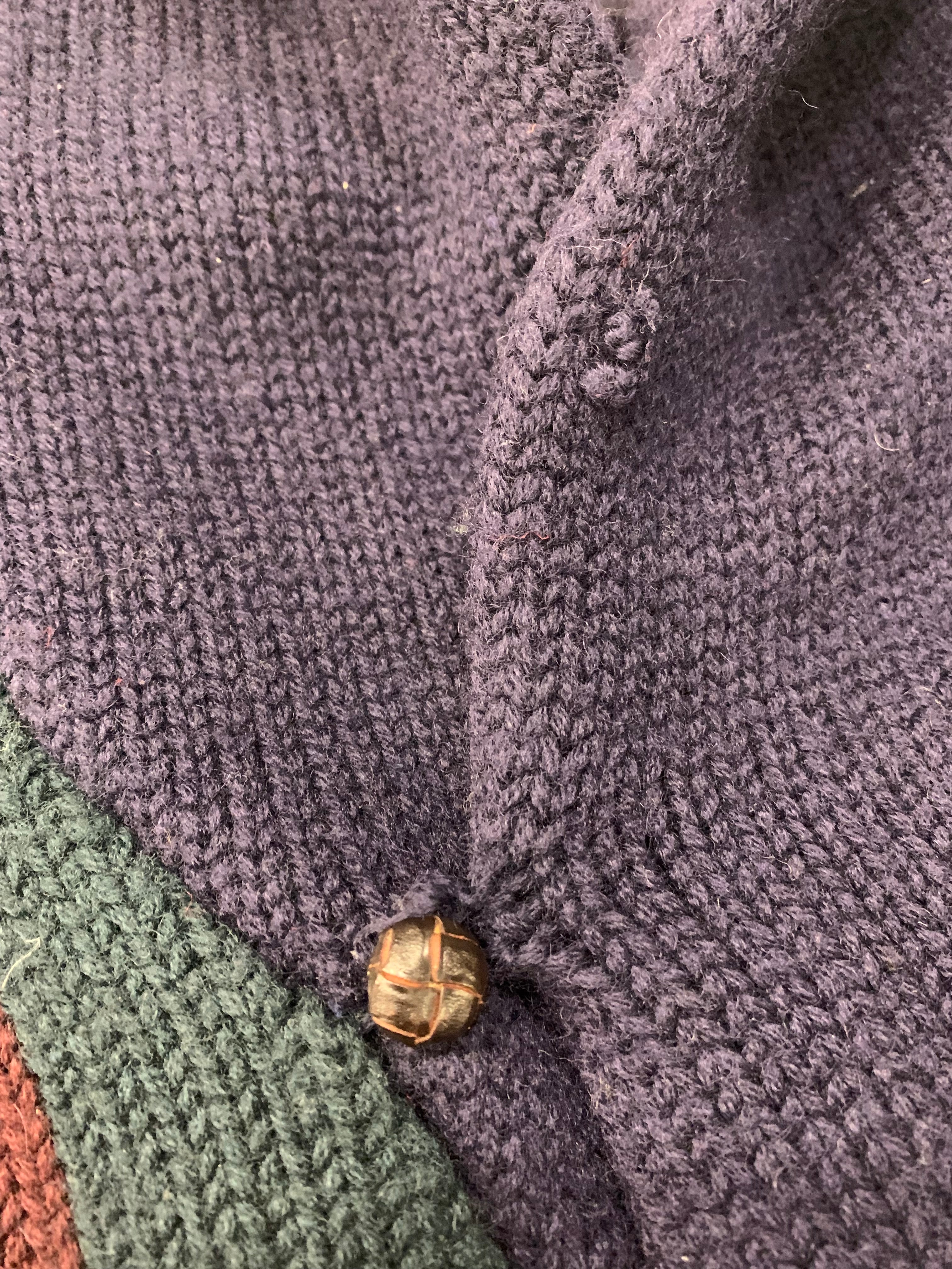 毛玉による着用感あり、目立つダメージなし。ショール部の一番上のボタン欠損。